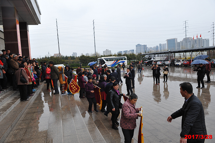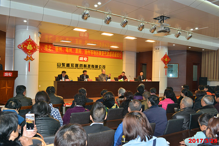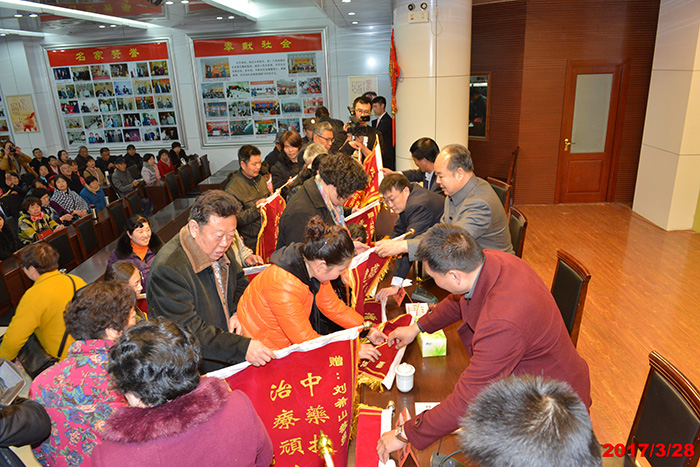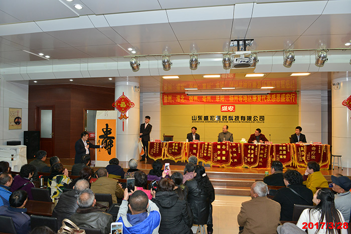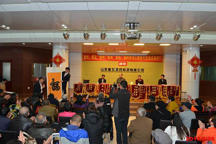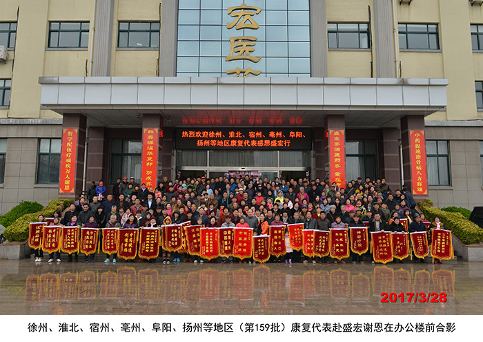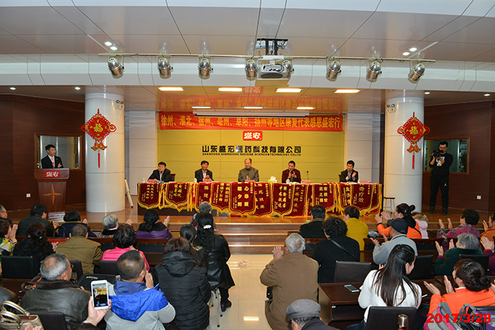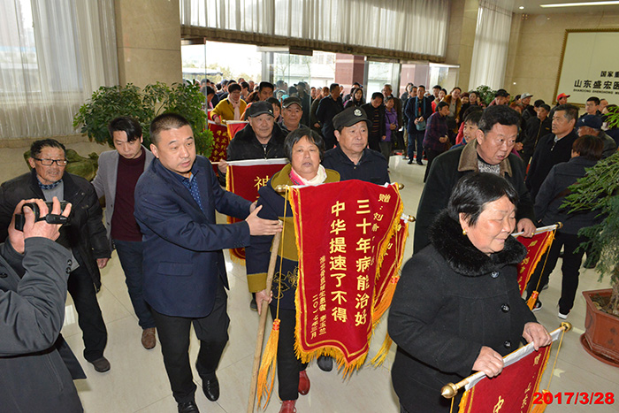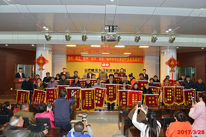 ——全國第159批感恩盛宏行掠影 “希山先生配良藥,醫術高尚除病魔;萬民深感盛宏恩,專到濰坊送贊歌。”年過花甲的江蘇老人王福芹先生不遠千里來到山東濰坊,要當面感謝良醫劉希山教授治好了他的頸椎頑疾,并作詩表達真情。 2017年3月28日,來自徐州、淮北、宿州、亳州、阜陽、揚州等地區,近400名腰椎間盤突出、股骨頭壞死、頸椎病、膝關節骨性關節炎、滑膜炎等頑疾康復患者赴盛宏公司總部謝恩。至此,赴盛宏謝恩者已經達到了27省、100多地市、159批,共計六萬多人次。中藥提速專利發明人、盛宏公司董事長劉希山親自迎接謝恩者。安徽中藥提速服務中心主任黃鳳偉代表患者致感謝詞。 劉希山董事長為大家作健康報告,感謝全國用戶和社會各界對盛宏的厚愛。劉教授雖然不提療效,但電磁治療儀(股骨頭治療儀)治療骨病頑疾的安全速效已經被在座的患者印證,大家頻頻給予劉教授熱烈的掌聲。康復患者們滿懷感激之情獻上錦旗,并分享了治療體會。盛宏萬旗館收藏錦旗達到了15000多面。 |