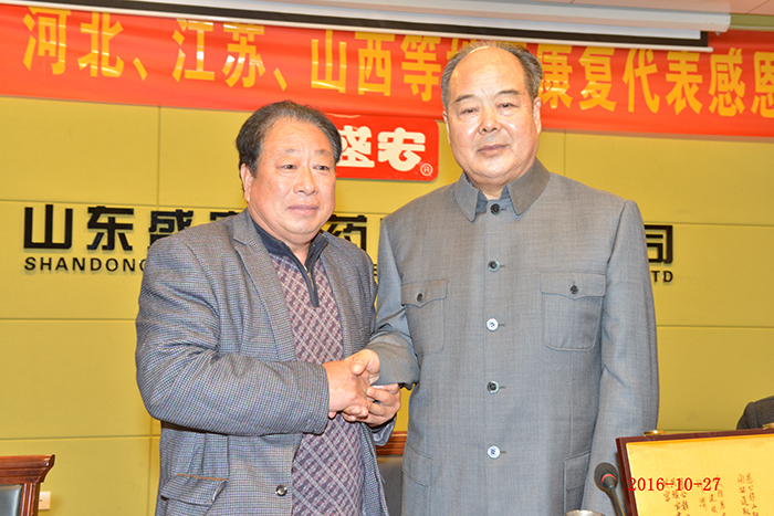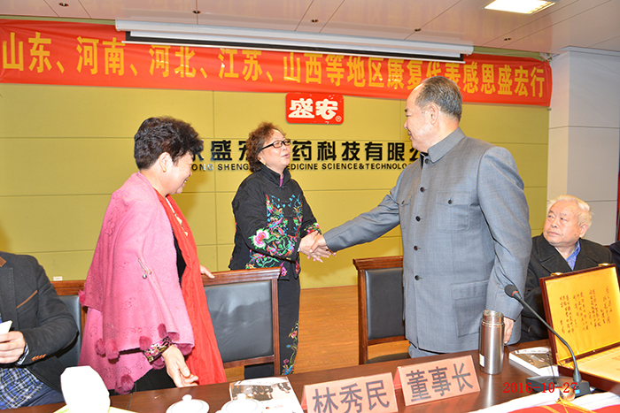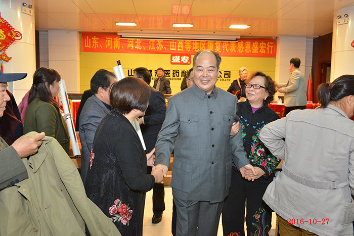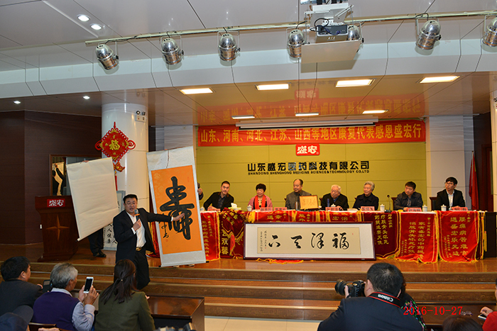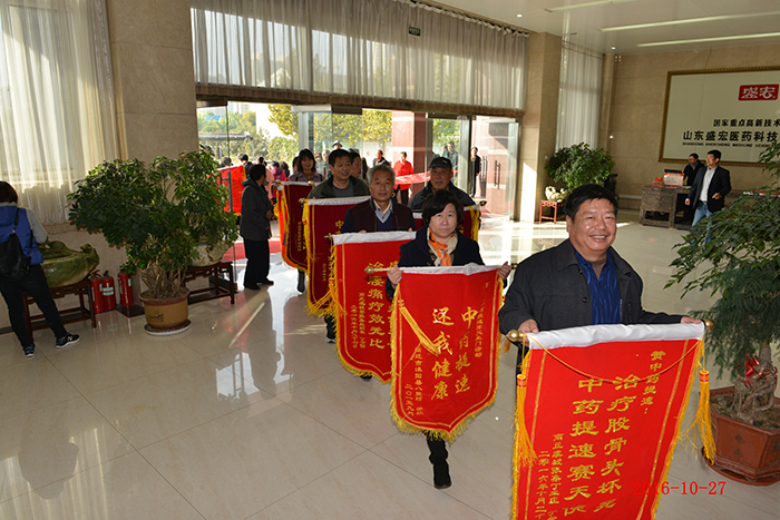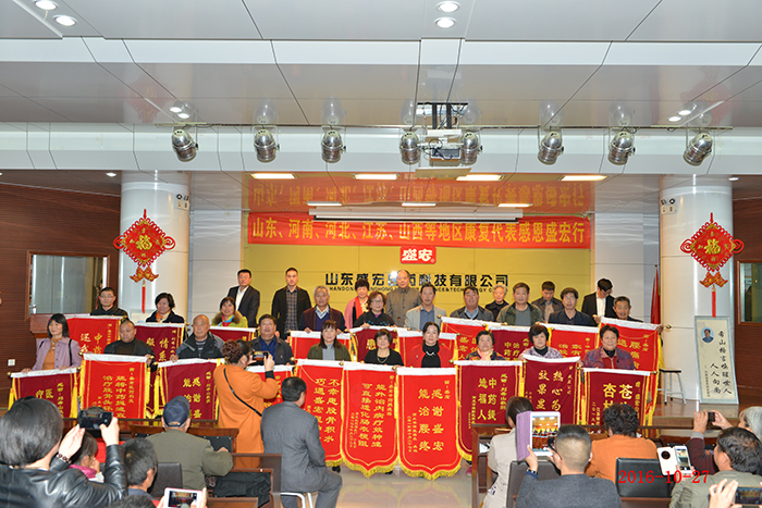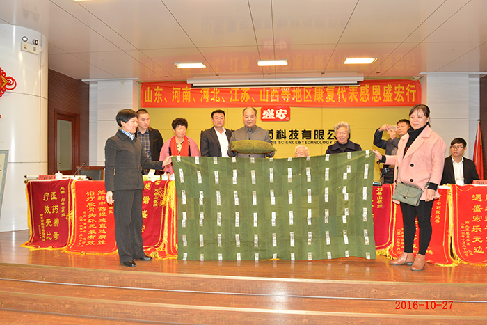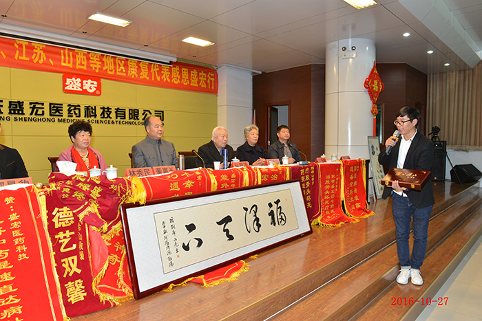 全國第158批感恩盛宏行—肺癌晚期患者林秀民第三次赴盛宏感謝救命恩人 生命垂危,負債累累——棲霞林秀民女士因患肺癌晚期在醫院治療花了100多萬元,等來的卻是“你的生命也就是一個星期左右,最多不會超過三個月”的醫生判決。2013至2015年,劉希山教授為她免費救治兩年獲得康復。今天,林女士第三次赴盛宏感謝救命恩人劉教授…… 82歲商丘老干部張君清患股骨頭壞死獲康復,他攜老伴十四載宣傳電磁治療儀和中藥提速透化療法,如今祖孫三代做盛宏…… 83歲河南急性腦梗老人在孝順兒子趙友功安排下使用電磁治療儀七次能行走…… 康復患者在臺上分享時熱淚盈眶,臺下感動地熱淚盈眶,劉希山教授流下欣慰的淚水—— 2016年10月27日,河南、江蘇、河北、山西、遼寧、山東等地的300多名股骨頭壞死、腰椎間盤突出、頸椎病、肩周炎等頑疾康復患者赴盛宏公司謝恩。至此赴盛宏謝恩者已經達到了27省、100多地市、158批,共計六萬多人次。劉希山董事長為大家作健康報告,全場無數次響起雷鳴般的掌聲,各地康復患者獻上一面面謝恩錦旗,醫患和諧場景感天動地。見證盛宏造福人民事業的盛宏萬旗館,收藏錦旗已經達到了15000多面。 盛宏電磁治療儀和中藥提速透化療法已經造福百萬患者,深入到千家萬戶,深入到頑疾患者的心坎!