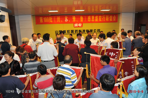 2010年9月9日,盛宏公司愛心捐贈醫療器械產品暨第100批感恩盛宏行到達儀式在高新區盛宏公司會議室舉行,濰坊市婦聯主席聶振萍、市藥監局局長咼智義、市民政局局長孟祥志、市高新區管委會副主任牟丕宗、市藥監局副局長牛世禮、市慈善總會副會長馬全海等領導出席儀式并分別講話,各位領導對盛宏公司的科技創新和醫患和諧給予高度評價。王秋萍總經理致歡迎詞。劉希山董事長最后作中藥提速健康報告。