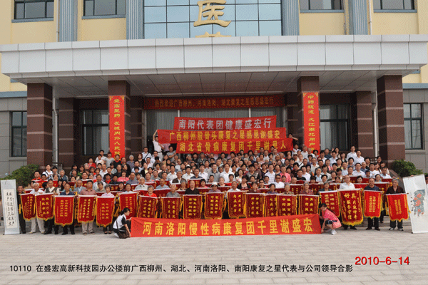 “盛宏造福福萬戶,萬戶依戀戀盛宏!” 2010年6月14日,正值端午節來臨之際,廣西柳州、湖北和河南洛陽、安陽的300多名康復患者攜帶錦旗到達盛宏感謝,這是湖北李忠發先生代表湖北患者向中藥提速專利發明人劉希山教授獻上的字畫。至此到盛宏總部謝恩的康復患者代表達到了25省100余地市76批共計8000多名。王秋萍總經理致熱情洋溢的歡迎詞,湖北服務中心主任魏天明、河南洛陽服務中心主任王濤、柳州服務中心主任何煒分別代表康復患者致感謝詞。 “氣為血之帥,血為氣之母,血通則氣通,血止則氣絕。導致頑疾的原因是氣滯血瘀,導致猝死的原因是氣絕血凝”,劉希山教授的中藥提速健康報告受到客人們熱烈歡迎,“盛宏中藥提速沿用了古代砭、針、灸、藥的中醫治病原理,采用其方法,不用其做法,電磁、電熱、遠紅外、強透化、藥氣離子導入五大現代技術,迅速活血化瘀,打通血脈,對治療股骨頭壞死、肝病、腎病、腰椎間盤突出等頑疾實現了快速見效,先后榮獲了31項國家專利……這就是為什么‘盛宏電磁治療儀,仿冒產品可以與其形似,但無法神似;可以模仿它的外觀,但無法模仿它的療效’的根本原因!” 康復患者們紛紛向劉教授獻上錦旗,并鞠躬感謝,醫患之情如魚水交融,感人至深。楊春梅老人五次鞠躬不已的場面讓人熱淚盈眶。年過八旬的湖北天門市革命傷殘軍人、離休干部董俊林老先生不能親來,托人帶來了一面錦旗和他的親筆感謝信,信中寫道:“我從2003年開始認準盛宏,盛宏把我從死亡線上拽了回來。我向劉教授獻上一首歌:沒有盛宏儀,沒有我康健;沒有劉希山,沒有我今天……”宣讀之后,全場動容。