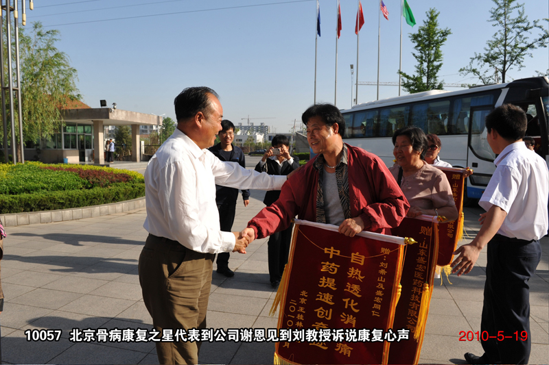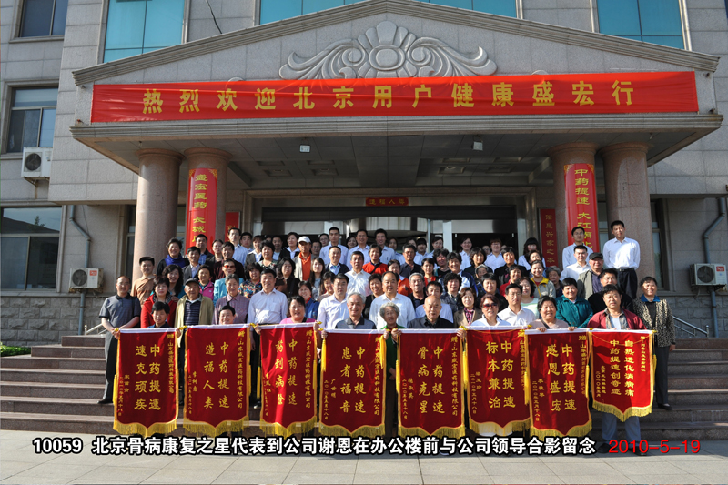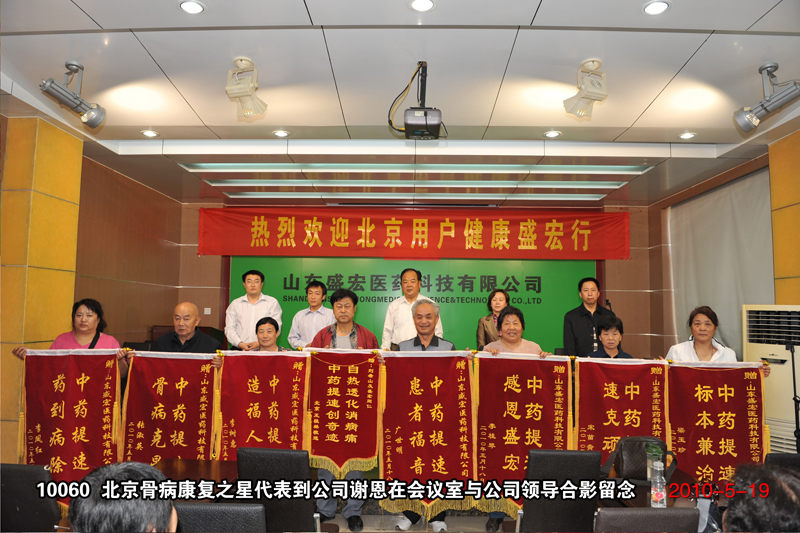 2010年5月19日,陽光明媚,萬紫千紅,北京市50多名頸椎病、腰椎病、股骨頭壞死、關節病等頑疾康復之星,以及河北、山東、湖北、內蒙五省、市、自治區的30名患者,滿懷感激之情,不遠千里共赴盛宏感謝中藥提速第一人劉希山教授。至此,因使用中藥提速系列產品而獲得健康的感恩患者達到了25省90余地市65批共計6900多名。盛宏公司總經理王秋萍向來賓致熱情的歡迎詞,北京中藥提速服務中心主任國慶代表康復患者致感謝詞。
