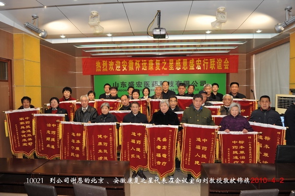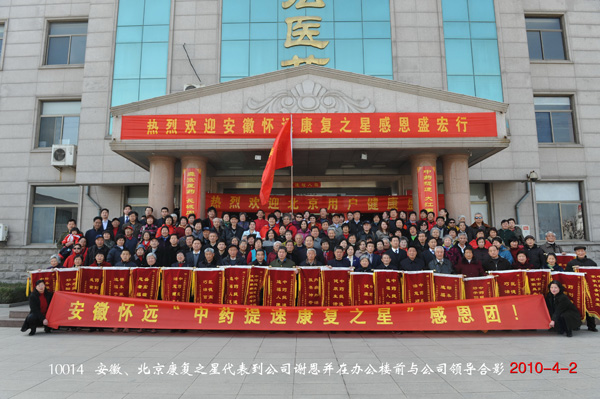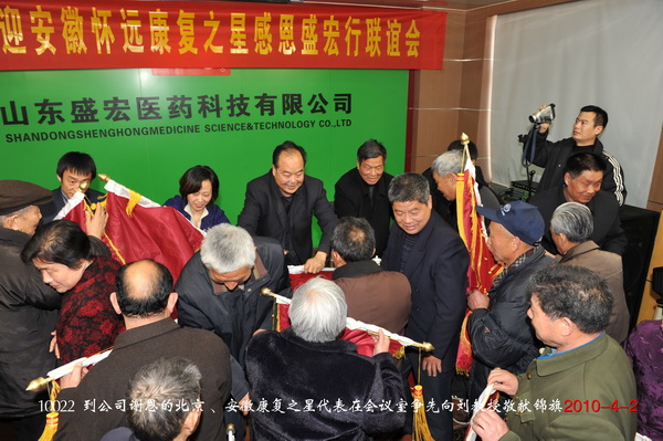 2010年4月2日,陽光明媚,百花盛開,山東盛宏醫藥科技有限公司迎來了十二周歲的生日,同時迎來了從安徽懷遠和北京市趕來謝恩的近200名頸椎病、腰椎病、股骨頭壞死、關節病、乳腺炎、附件炎等頑疾康復之星。“中藥提速,造福人民”,至此,因使用中藥提速系列產品而獲得健康的感恩患者達到了25省90余地市61批共計6000余名。