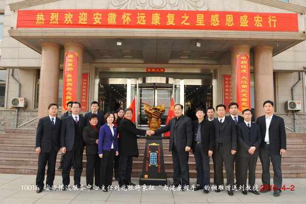 報告結束,幾十名頑疾康復患者擠上主席臺向劉教授獻上了錦旗并鞠躬感謝。安徽懷遠主任劉兆銀代表懷遠康復患者將一座象征“與健康握手”的銅雕贈送給盛宏公司,以表達廣大患者對“中藥提速第一人” 劉希山教授的崇高敬意,并祝賀盛宏公司成立十二周年。