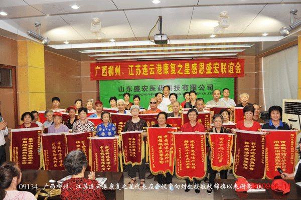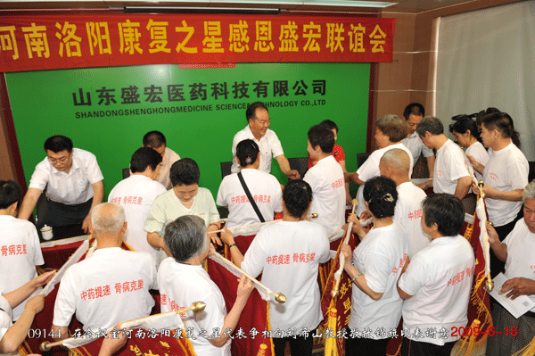 2009年6月16日,河南洛陽70名股骨頭壞死、頸椎病、糖尿病、前列腺肥大等頑疾康復患者到達盛宏公司,成為第42批前來感謝的隊伍,至此感恩患者代表達到了近5000人,盛宏公司成為舉世矚目的憑療效轟動醫藥界的醫患和諧典范。 王秋萍總經理首先致歡迎詞。洛陽服務中心主任王濤代表康復患者致感謝詞。劉希山教授為大家獻上了健康盛宴——中藥提速專題報告。為什么中藥提速能速克頑疾?劉希山教授介紹了三個要點: 一、頑疾的發生大都來自氣滯血瘀,治療的關鍵就是活血化瘀。 二、治頑疾必須滿足“三大要素”,那就是“足量、有效的藥物和直達病灶”,“藥到病除”就是“藥到病灶病才除”。 三、滿足以上條件的唯一方法就是采取內病外治、經皮給藥、透化注射。電磁治療儀通過繼承和發揚古代中醫藥“砭針灸藥”療法,實現了五大療法對準病灶同時活血化瘀,可謂“殺雞用了宰牛刀”! 報告后康復患者紛紛獻上自己感恩的錦旗,并向劉希山教授和王秋萍總經理訴說了他們康復的經歷、感激的心情。