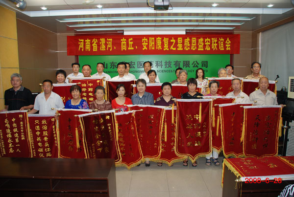 | 2008年6月28日,盛宏公司同時迎來河南漯河、商丘、安陽三批健康感恩代表共120余人,這是第二十、二十一和二十二批感恩團,其中安陽是第二次來公司感恩的隊伍。 在歡迎儀式上,盛宏公司王秋萍總經理致歡迎詞,她向客人介紹了公司在董事長的堅強領導下不斷發展壯大的輝煌經歷和美好前景,表示了對客人們的美好祝愿。商丘中藥提速服務中心主任楊緒英、漯河中藥提速服務中心主任闞松峰、安陽中藥提速服務中心主任趙青田分別發言,他們滿懷激情地說:“我們每天接待很多患者,工作很繁忙,但內心很快樂,很充實!因為我們每一位服務人員都知道,自己所做的工作是在為人民造福!” 在眾人熱切期待中,公司董事長劉希山應邀作了中藥提速學術報告,劉希山董事長講道:“看到你們今天健康的身體, 我非常高興,歡迎你們回到盛宏這個健康之家!‘無效產品廣告吹,有效產品靠口碑’,正是你們的康復和積極宣傳,贏得了盛宏的口碑……”隨后,劉教授就“氣滯血瘀”和“活血化瘀”辯證關系做了精彩闡述,贏得了全場陣陣掌聲。同時為七所大學客座教授的劉希山董事長還簡略向大家講解了人生“命運”的一般規律。 奉獻錦旗的場面激動感人,一批批康復之星走上主席臺,將錦旗奉獻給自己最尊敬的劉教授,并在現場訴說著錦旗背后的辛酸往事、康復故事: 毛鮮華老太太,60多歲,是一位關節炎、骨刺患者,為了治病她嘗試了很多方法,都不管用。后來聽說盛宏電磁治療儀是中藥提速產品,立刻買回家去,結果不到半年就完全康復,到現在近10年時間沒有復發。老人送上錦旗:盛宏到我家,增生全拿下!朱華東是一位軍人,他這次來盛宏是代表家中85歲的老母親表達謝意。他母親也是一位軍人,在戰爭年代落下了風濕性關節炎的毛病,去過上海、鄭州、北京等許多大醫院,中醫、西醫輪流治,始終沒能治好。因為老人年齡大不適宜做手術,這些年吃藥又吃壞了胃,所以不敢再接受治療。聽別人介紹內病外治的盛宏產品療效不錯時,她開始不相信全國大醫院都治不好的病盛宏能治好,隨后抱著試試的心理去了盛宏河南服務中心試治,兩個星期以后老人上車下車就不用人攙扶了,不到一個月上下樓自如,疼痛消失。這樣的康復患者還有很多:像呂厚東,因車禍致股骨頭壞死,遭受多年病痛,用了中藥提速療法不到半年時間痊愈;張英,使用電磁治療儀45天就治愈多年腰腿病和多年腎虛;張秀玲,用盛宏電磁治療儀同時治好了頸椎病、類風濕關節炎…… 晚上,賓主雙方進行了感恩聯歡。王秋萍總經理一曲優美抒情的《為了誰》,帶動起全場晚會的氣氛。雙方用歌曲、舞蹈、詩歌朗誦等豐富的藝術形式交流著健康,抒發著對生命的熱愛,表達著人生的感恩之情。 五月烈日照開萬紫千紅,中藥提速祛除萬家疾病。盛宏感恩患者,患者感恩盛宏,感恩之行,永駐世間!