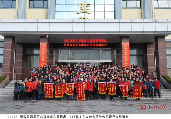 2011 年11月30日 ,來自北京的200多名頸椎病、腰椎間盤突出、股骨頭壞死、肩周炎、關節炎等康復之星抵達盛宏公司感謝。至此,全國共有25省、100多地市、116批共計近19000名康復患者到盛宏謝恩。盛宏公司總經理王秋萍致歡迎詞,北京中藥提速服務中心主任袁道田代表康復患者致感謝詞。廣大康復之星們現場交流了使用盛宏透化帶快速康復的治療體會,那真誠的感恩之心和感謝話語引起全場陣陣共鳴的掌聲。