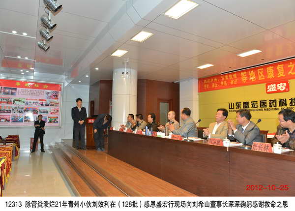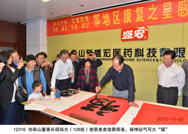 2012年10月25日,商丘、宿遷、瀘州、許昌、開封、敦煌等四省六市近300名骨病頑疾康復患者到達盛宏公司謝恩,并向劉希山教授獻上錦旗。謝恩者達到了27省、100多地市、128批、24000多人次。聯合國美術家協會副主席、中國書畫家協會副主席徐一發等社會各界人士也來到了盛宏。中國民族醫藥開發委員會副會長、盛宏公司董事長劉希山教授應邀為謝恩者作健康報告。 報告會一開始,播放了 32 歲的脈管炎患者劉效利二十多年求醫無門、雙腿潰爛、后被劉希山教授救治的紀實故事,感動了現場所有的人。劉效利本人也來到了報告會現場,他哽咽著說:“這么多年沒治好的病,劉教授只用了幾天時間就恢復得這么好,這是之前想都沒敢想的效果。劉教授是救命恩人,不僅救治了我的腿,也保住了我的命,讓我重新燃起了生活的希望!” “脈管炎是全世界都不能攻克的疾病,是不死的癌癥,盛宏有辦法!”劉希山教授自信地說,“我們之所以能在脈管炎、腫瘤等領域取得突破,原因就在于堅持‘兩通一透’的治療方法。”劉希山教授進一步解釋說,所謂治標治本,本就是通,通則不痛。盛宏電磁治療儀能讓足量有效藥物到達病灶,實現氣血通暢,所以安全有效。劉希山教授還在現場懸方濟世,將“一元治感冒”的秘方告訴大家。劉教授說,他還會想更多更好的辦法,徹底為大家解決看病難、看病貴的問題。 康復患者懷著激動的心情獻上了一面面鮮紅的錦旗,一句句感激的話語,一個個深情的擁抱,現場形成了一片紅色的海洋。 劉希山 教授應大家邀請現場獻上墨寶,徐一發主席也揮毫潑墨寫下了“盛宏騰飛,德行天下”八個大字贈劉希山董事長。 附部分康復病例: 劉宗斌,男, 45 歲,河南開封人,患有股骨頭壞死 3 年,曾經癱瘓在床不能行走,甚至產生了輕生的念頭。今年年初,經朋友介紹開始使用盛宏電磁治療儀,到 2012 年 10 月 25 日 為止 8 個月,已經完全康復。劉宗斌現在是開封服務中心主任,他說,劉教授不僅救了他自己,還挽救了他整個家庭。他希望更多的人能夠通過盛宏重新獲得健康。 王顯揚,男, 81 歲,四川瀘州人,患頸椎病多年。去年年底,因頸椎病壓迫神經導致腦梗,醫院已經通知病危。后來得知盛宏電磁儀可以治療頸椎,于是開始使用。到 2012 年 10 月 25 日 已經使用了 9 個月,已經完全恢復健康,身體非常硬朗。 孟新麗,女, 55 歲,河南商丘人,頸椎病骨質增生。患病多年,非常嚴重,通過家人得知盛宏電磁治療儀,到 2012 年 10 月 25 日 為止已經使用了 8 個月,已經完全康復。孟新麗說,希望越來越多的人能早日通過盛宏電磁儀擺脫痛苦。 張玉英,女, 69 歲,河南許昌人,腰、膝關節,腿腫了十幾年,動過手術也沒有治愈,通過姐姐介紹得知盛宏中藥提速產品,到 2012 年 10 月 25 日 使用了 6 個月,已經恢復健康,她因感激流下熱淚。 曹長專,男, 55 歲,江蘇宿遷人, 2008 年患股骨頭壞死多年,曾跑遍了南京各大醫院,均無法治療。后來通過報紙得知盛宏中藥電磁治療儀,使用 1 年的時間好轉,因為父母治病停用兩年。今年因加重又使用 3 個月,出現奇跡,腿不痛了,拍片大夫說基本康復。曹長專說:“希望廣大病友患了骨病不要東跑西跑了,就到山東盛宏來,肯定會治好的!” |