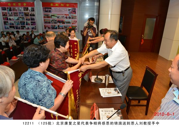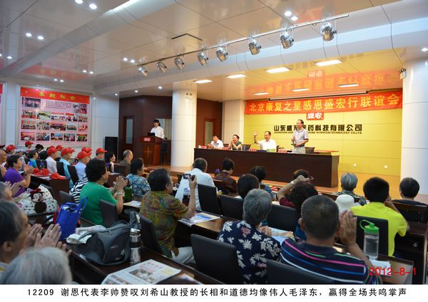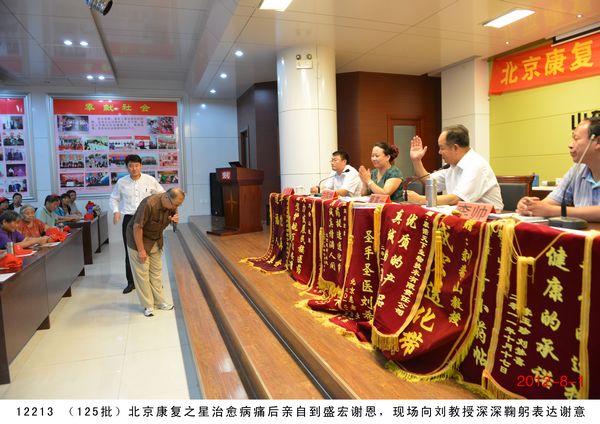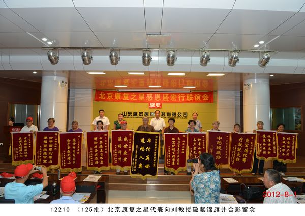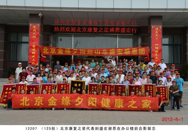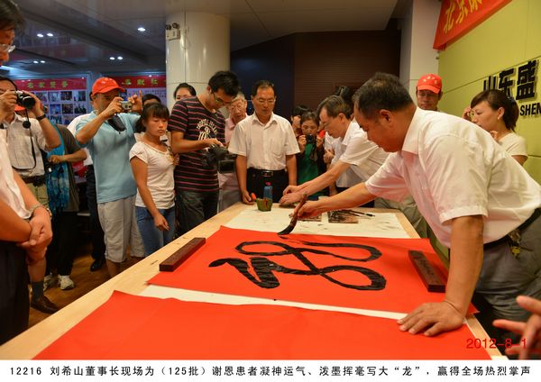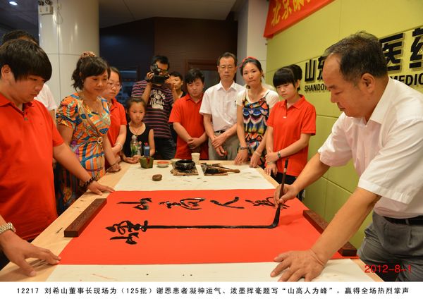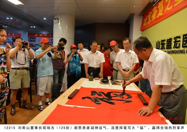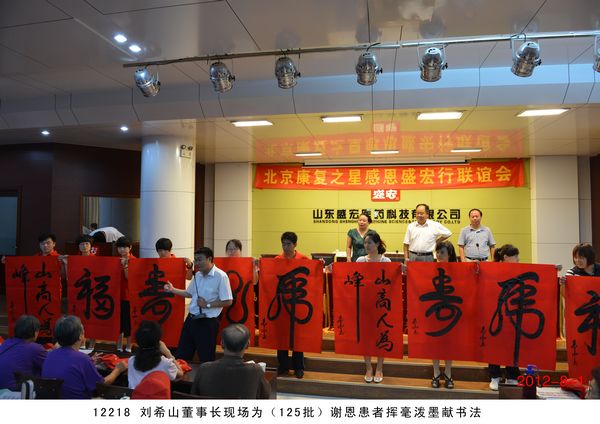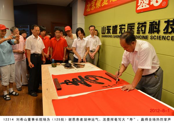 第 125 批北京感恩盛宏行到達 2012 年 8 月 1 日 ,北京近 200 名骨病頑疾康復患者到達盛宏公司謝恩并向劉希山教授獻上錦旗,謝恩者達到了 27 省、 100 多地市、 125 批、 22000 多人次。盛宏公司依靠中藥提速 35 項專利和獨特的療效,創造出了世界治療骨病頑疾和醫患和諧的兩大奇跡 。中國民族醫藥開發委員會副會長、濰坊市道德模范、盛宏公司董事長、中藥提速專利發明人劉希山教授應邀為謝恩者作健康報告 ,贏得首都客人熱烈 歡迎。 為回報大家的厚愛, 劉希山董事長還向客人們贈送了治療燒燙傷和創傷的純中藥產品“創傷凈”,并應邀現場獻上墨寶,他的一筆“龍”“虎”、三才“福”“壽”、“山高人為峰”等作品受到客人們高度評價并爭相收藏。 |
