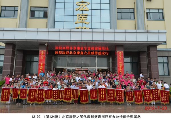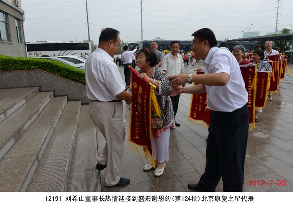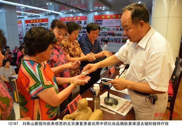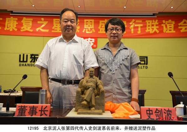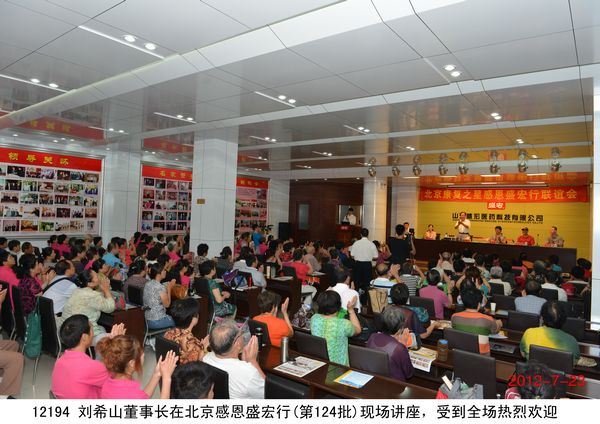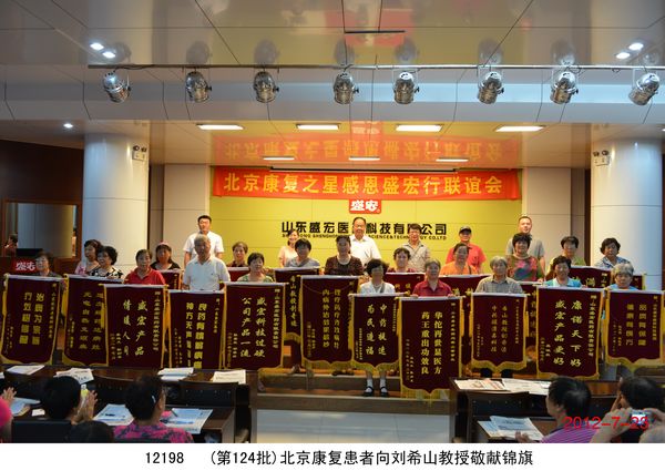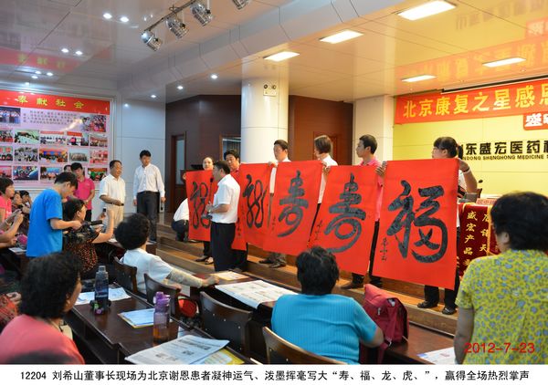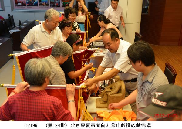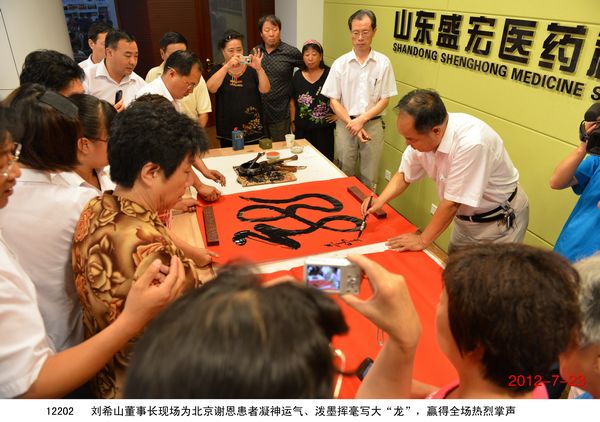2012年7月23日,北京200多名頸椎病、腰椎間盤突出、關節炎、婦科病等頑疾康復患者乘坐大巴到達盛宏公司謝恩獻錦旗,謝恩者達到了27省、100多地市、124批、22000多人次。北京泥人張第四代傳人史劍波先生同日蒞臨拜訪。 “中醫是祖國的瑰寶,精通辨證施治,有時一元錢等于一千元的效果……”劉希山董事長應邀為大家作中藥提速報告,他在講治療骨病頑疾的同時,順便將他臨床百試百驗、省錢省心的治感冒發燒配方贈與首都客人,全場報以熱烈的掌聲。康復患者們爭先恐后獻上錦旗,北京客人郭翰遠懷著激動的心情高歌一曲《留一點愛給自己》獻給劉教授表達敬意;67歲的用戶常靜環老人即興作詩一首《再世華佗》,“山東好漢劉希山,社會責任勇于擔。一卷寶典照人間,既是凡人也是仙……中藥提速第一人,‘再世華佗’美名傳”表達了全體謝恩者的心聲,全場響起雷鳴般的掌聲。泥人張傳人史劍波先生向劉教授贈送了剛剛創作的酷似偉人毛澤東的泥人作品“哲人奇人善人——劉希山”,史劍波先生說:“劉希山教授無論內在,還是外在,都與偉大領袖毛主席相似,他是大愛的代表!” 首都客人們紛紛向劉希山董事長索要墨寶,劉教授可謂有求必應,只見他現場展紙運筆,眨眼間,一筆“龍”“虎”競天地,三才“福”“壽”照高堂,“山高人為峰”,妙筆驚全場。大家掌聲經久不息。