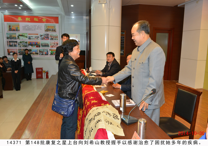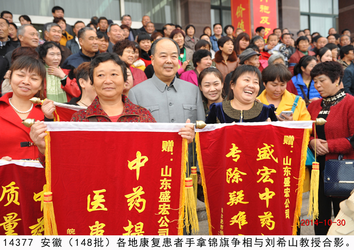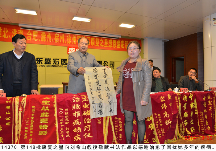 第148批股骨頭壞死、腰椎間盤突出等 康復患者赴盛宏謝恩 “透化醫百病,德藝雙馨美名揚!”安徽淮南許建美女士使用山東盛宏醫藥產品后快速見效,不遠千里將親手寫的書法交到發明人、被莫言題贊為“哲人奇人”的劉希山教授手中。 2014 年10月30日,安徽淮北、淮南、合肥、滁州、宿州、徐州等地近300名股骨頭壞死、腰椎間盤突出、頸椎病等頑疾康復患者來到盛宏公司謝恩。山東省優秀共產黨員、道德模范、盛宏公司董事長劉希山,總經理王秋萍,華風書畫院院長呂傳義等共同接見了謝恩者,大家紛紛向劉希山教授獻上了滿懷感激之情的錦旗。至此,赴盛宏謝恩的康復患者達到了27省、100多地市、148批,共計五萬多人。 王秋萍總經理致熱情洋溢的歡迎詞;安徽盛宏服務中心主任黃鳳偉滿懷激動之情,代表康復患者們向劉希山教授致以崇高謝意。呂傳義院長三次親臨現場,目睹醫患真情深受感動,他在講話中對劉希山教授和盛宏公司給予了高度評價。 “盛宏產品無限好,引無數仿冒競折腰。”“ 盛宏電磁治療儀產品,你可以形似,但無法神似。你可以模仿它的外觀,但無法模仿它的療效…… ”劉希山教授應邀為客人作健康報告。他用深入淺出的語言地將電磁治療儀的治病原理和“秘密”揭示出來,并現場親自嘗藥,讓廣大用戶進一步看到了透化療法在提速療效的基礎上具有的綠色安全特點。全場爆發出經久不息的掌聲。 附部分康復病例: 1 、韋學玉,女,安徽人,51歲,患腰椎間盤突出6年,常年吃藥、打針,生活基本不能自理。使用盛宏電磁治療儀僅僅3個療程,現在(2014.10.30)已基本康復。 2 、王其良,男,江蘇人,53歲,患有雙側股骨頭壞死多年,中醫、西醫都咨詢治療過,均無明顯效果。使用盛宏透化療法6個月時間,效果良好,目前(2014.10.30)跟常人一樣正常走路,并現場演示分享。 3 、李翠芳,女,合肥人,49歲,患有網球肘,整個左胳膊酸疼、麻木,嚴重的時候不能動,非常痛苦。使用盛宏電磁治療儀不到一個療程康復。 |