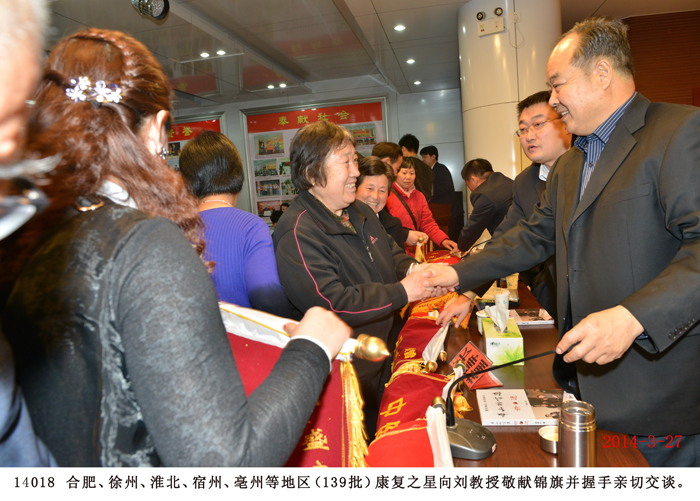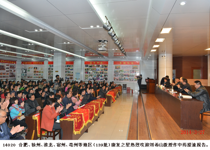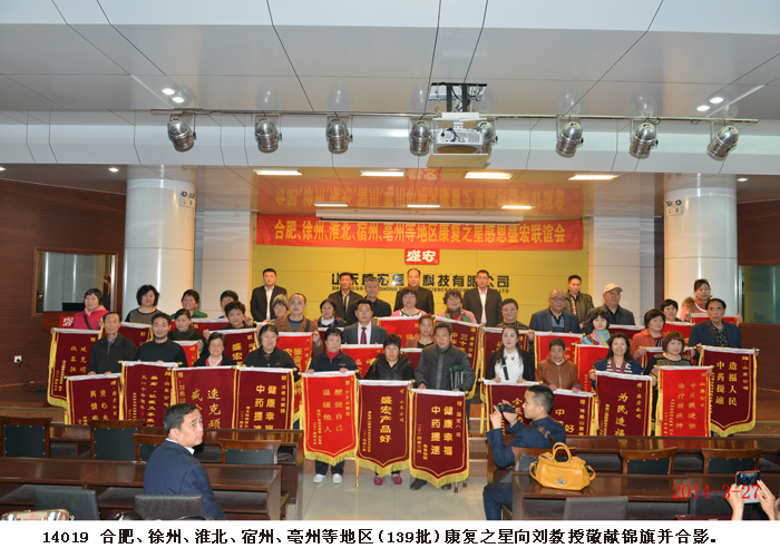 2014年3月27日,江蘇徐州、安徽合肥、淮北、宿州、亳州等地的200多名股骨頭壞死、腰椎間盤突出、頸椎病、關節炎等頑疾患者來到盛宏公司謝恩,并向劉希山教授敬獻了錦旗。至此,赴盛宏謝恩的康復患者達到了27省、100多地市、139批共計四萬多人。 為什么這么多人感謝劉希山教授?為什么這么多批頑疾患者感謝盛宏?為什么盛宏的醫患和諧關系感動中華、催人淚下?——用康復患者們的話說:“盛宏為我們治好了病!” 劉希山董事長親自接待遠道而來的客人并為大家作健康報告。在報告中,劉教授創新的“用疏不用堵”的中醫理論與古代大禹治水的道理如出一轍,顯示了中藥提速、經皮給藥、活血化瘀治療頑疾的高明;而劉希山教授“懸方濟世”的社會效益,似乎又超越了“懸壺濟世”的局限性,他為人們應對不斷變異的感冒病毒和日益昂貴的醫藥費提供了免費妙方,讓人們花很少的錢就能快速治愈感冒。客人們對劉希山教授這種無私奉獻的精神報以經久不息的掌聲。報告結束后,大家爭相與劉希山教授緊緊握手,深情擁抱。