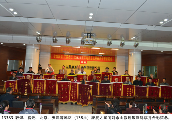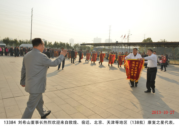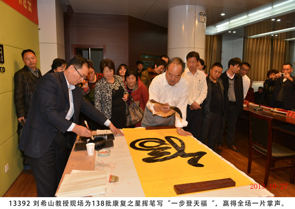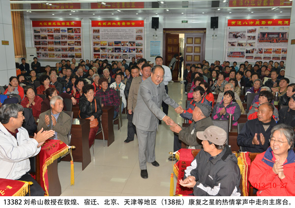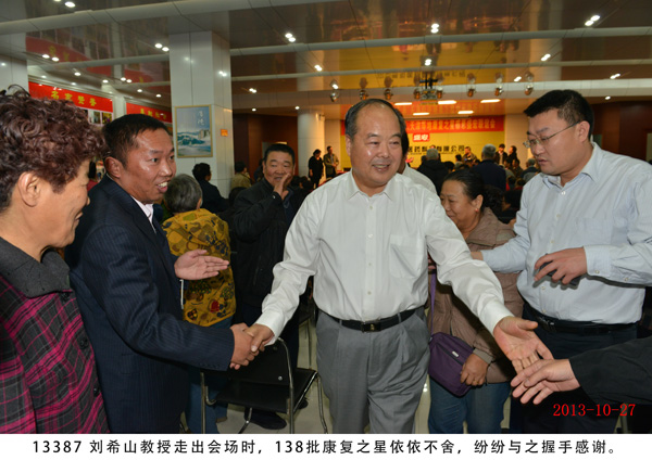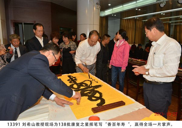 2013年10月27日,陸敬留先生與自發組織到山東濰坊謝恩的其他100多位江蘇宿遷康復用戶,一起來到了盛宏公司總部,感謝中藥提速發明人、山東省優秀共產黨員、被莫言譽為“哲人奇人”的劉希山教授,同期到來的還有北京、天津、甘肅敦煌等地的近200名康復患者,他們最遠的長途跋涉6000多里,其熱情讓人感動不已。盛宏公司董事長、盛宏中醫院院長劉希山親自接見各地謝恩者,并為大家作了一場精彩的養生和康復報告。最后,劉希山教授應邀揮毫潑墨,現場展示了其豪放大氣的書法藝術作品,令謝恩者大飽眼福。特別是一個“壽”字兩立意境:祥和高雅如觀音的“一生百年青年壽”,豪邁圓妙似太極的“香百年壽”,雖壽出兩種,而俱臻化境——大家無不報以熱烈的掌聲。